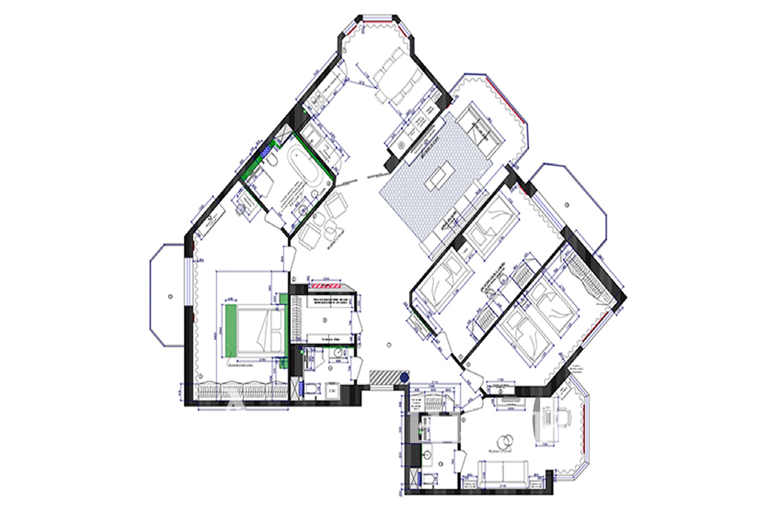 Планировка: кухня-столовая, гостиная, хозяйская спальня со своим с/у и гардеробной, три детских комнаты, одна со своим с/у, гостевой с/у, гардеробная.